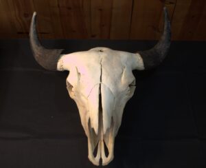This Grade B American bison skull carries the marks of a life well lived. Structurally sound and fully cleaned, these specimens may show cosmetic imperfections such as uneven horn alignment, surface staining, minor chips, natural asymmetry and or a more prominent dispatch hole.